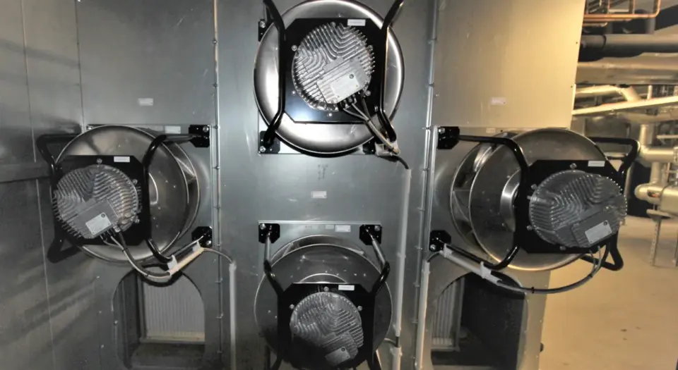 Seit 2021 moder­ni­sierte das Monta­ge­team von Daume insge­samt 9 Anlagen mit 61 RadiPac EC-Venti­la­toren der Gene­ra­tion 2 und 3. Um eine hohe Ausfall­si­cher­heit zu errei­chen, setzte Daume auf FanGrid: Statt eines großen Gebläses arbeiten nun mehrere EC-Venti­la­toren im Paral­lel­be­trieb – im Rathaus-Center je nach Bedarf der Anlage meist vier bis acht pro FanGrid. Diese Anord­nung sorgt für eine deut­lich höhere Betriebs­si­cher­heit. Fällt ein Venti­lator aus, erhöhen die übrigen auto­ma­tisch ihre Dreh­zahl, sodass die Luft­leis­tung konstant gehalten wird. Gerade im laufenden Betrieb des Rathaus-Center, in dem ein Ausfall sofort spürbar wäre, ist diese Redun­danz ein großer Vorteil.