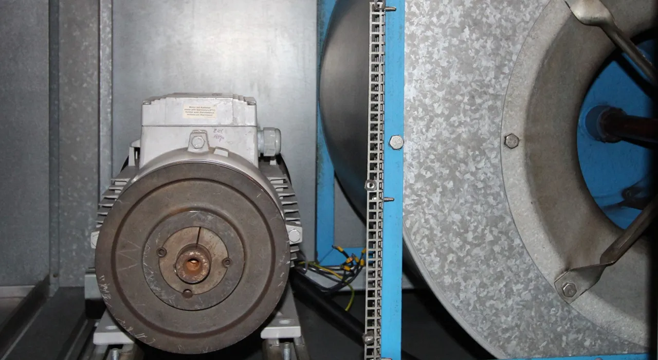 Die Lüftungs­an­lagen im Rathaus-Center stammen aus den späten 1990er-Jahren. Viele von ihnen waren noch mit keil­rie­men­ge­trie­benen, doppel­flu­tigen Gebläsen ausge­stattet – einer Tech­no­logie, die in Sachen Wirkungs­grad und Wartungs­auf­wand deut­lich hinter heutigen Stan­dards zurück­bleibt. Bei solchen Systemen über­trägt ein Keil­riemen die Motor­kraft über Riemen­scheiben auf das Geblä­serad. Reibungs­ver­luste und Mate­ri­al­ver­schleiß mindern dabei die Effi­zienz und erhöhen den Wartungs­auf­wand im Vergleich zu modernen, stufenlos regel­baren EC-Motoren.