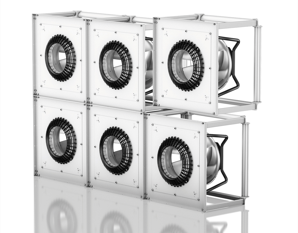 Jeder Radialventilator ist mit der bewährten Tragspinnenkonstruktion ausgeführt und wird so in einen Kubus aus Aluminiumformteilen und einer Tragplatte an der Saugseite eingebaut. Bei der Konstruktion dieses würfelförmigen Gehäuses wurde bereits ein wichtiger Faktor berücksichtigt, der in der Praxis häufig vernachlässigt wird: der Einbauverlust. Wenn Ventilatoren zu dicht nebeneinander positioniert sind, beeinflussen sie sich gegenseitig. Dabei gilt generell, dass je größer das zu befördernde Luftvolumen eines Ventilators ist, umso größer müssen die Abstände zwischen den Ventilatoren sein. Damit keine Einbauverluste entstehen, ist der Kubus des FanGrid-Moduls deshalb extra großzügig dimensioniert.