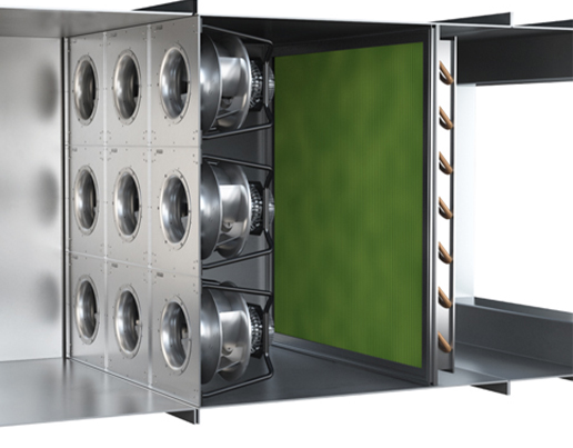 Treibende Kraft im FanGrid sind moderne EC-Antriebe mit Wirkungsgraden von über 90 %, die sowohl im Voll- als auch im Teillastbetrieb sehr energieeffizient arbeiten, auf hohe Lebensdauer ausgelegt sind und sich in der Drehzahl stufenlos regeln lassen.