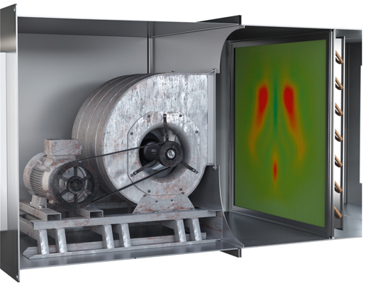 Bild 2: Die Luftverteilung im FanGrid ist wesentlich besser, vor- oder nachgeschaltete Komponenten wie Filter oder Wärmeübertrager werden gleichmäßiger angeströmt als beim Einsatz eines einzigen Ventilators. Das führt zu einer effizienteren Filterung der Luft sowie zu einer besseren Wärmeübertragungsleistung. (Foto | ebm-papst)