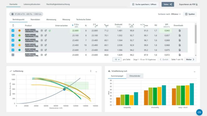 Das Tool berechnet automatisch, ob ein einzelner Ventilator oder ein FanGrid – also mehrere parallel betriebene Ventilatoren – die effizienteste Lösung darstellt. Dabei werden auch Redundanzanforderungen berücksichtigt, inklusive Rückströmungsvarianten. Die Software zeigt, wie viele Ventilatoren abgeschaltet werden können, ohne den geforderten Volumenstrom zu unterschreiten. Bis zu fünf Ventilatoren lassen sich im Detail vergleichen – inklusive Betriebspunktdaten, Abmessungen, Schallleistungs- und Luftleistungsdiagrammen. Im Expertenmodus stehen zusätzliche Kennzahlen wie der Fan Efficiency Index (FEI) zur Verfügung. Darüber hinaus ermöglicht der FanScout die Berechnung der Lebenszykluskosten über definierte Zeiträume hinweg – inklusive Beschaffungs-, Installations- und Servicekosten. Ein CO₂-Vergleich über die gesamte Produktlebensdauer unterstützt nachhaltige Investitionsentscheidungen. Ergebnisse lassen sich bequem teilen oder als PDF exportieren.