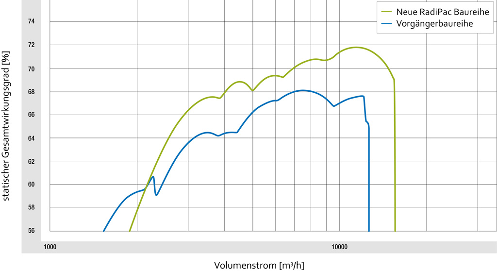 Der Motoren- und Ventilatorenspezialist ebm-papst stellt sich schon seit Langem einem kontinuierlichen Verbesserungsprozess in der Ventilatorentechnik. So wurden die speziell für den Einsatz in Klima- und Raumluftgeräten konzipierten Radialventilatoren der RadiPac Baureihe in den letzten Jahren stetig optimiert, wobei vor allem auf die Energieeffizienz, aber auch auf die Geräuschreduzierung und das „Handling“ Wert gelegt wurde. Mit dem neuen RadiPac ist es gelungen, diese erfolgreiche Baureihe noch einmal entscheidend zu verbessern. Die Radialventilatoren der neuen Generation arbeiten mit höheren Wirkungsgraden (Bild 1).