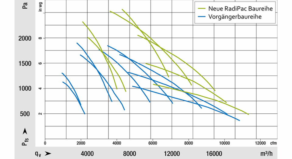 Höhere Drehzahlen sorgen für mehr Volumenstrom und höhere Drücke, so dass sich selbst Hochdruckanwendungen abdecken lassen (Bild 2). Die erreichbare statische Druckerhöhung liegt deutlich über 2000 Pa. Außerdem ist die Geräuschentwicklung weiter gesunken; abhängig vom Betriebspunkt liegt die Schallpegelreduzierung zwischen 3 bis 7 dB(A) im Vergleich zur Vorgängerbaureihe.