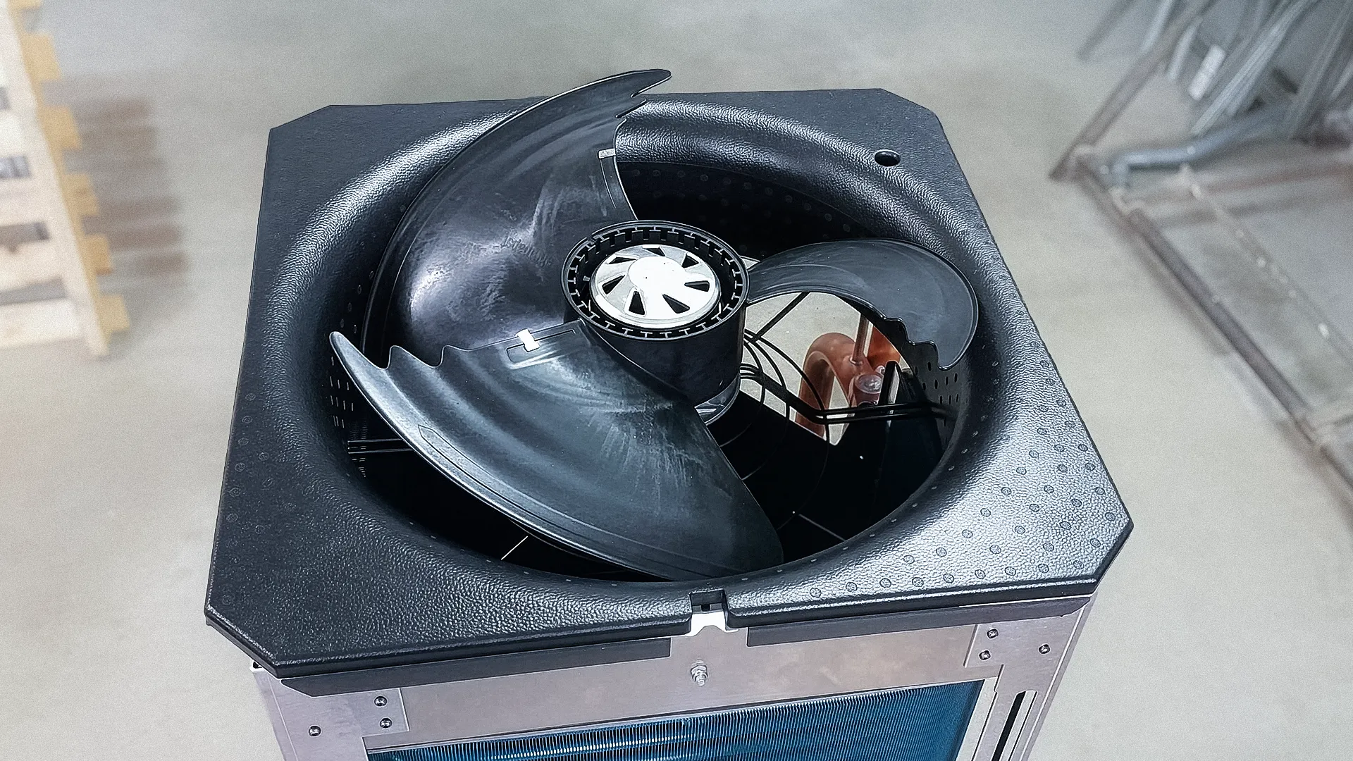 “The 450 mm AxiTone fits into the Triton concept without any major adjustments. It delivers the necessary airflow while remaining highly efficient—and, above all, quiet,” explains Schlittler. During the day, the noise level is around 53 dB(A), and at night it drops to as low as 35 dB(A). In conventional heat pumps, the air usually flows in from the side. In Triton, the AxiTone is located on top of the outdoor unit and pushes the air down through the ring-shaped heat exchanger. This air flow ensures an even flow through the heat exchanger and contributes significantly to the low noise level. “The AxiTone offers enormous advantages for us,” says Degelo. “At night, Triton is barely audible compared to other heat pumps on the market—we owe this largely to this fan.”