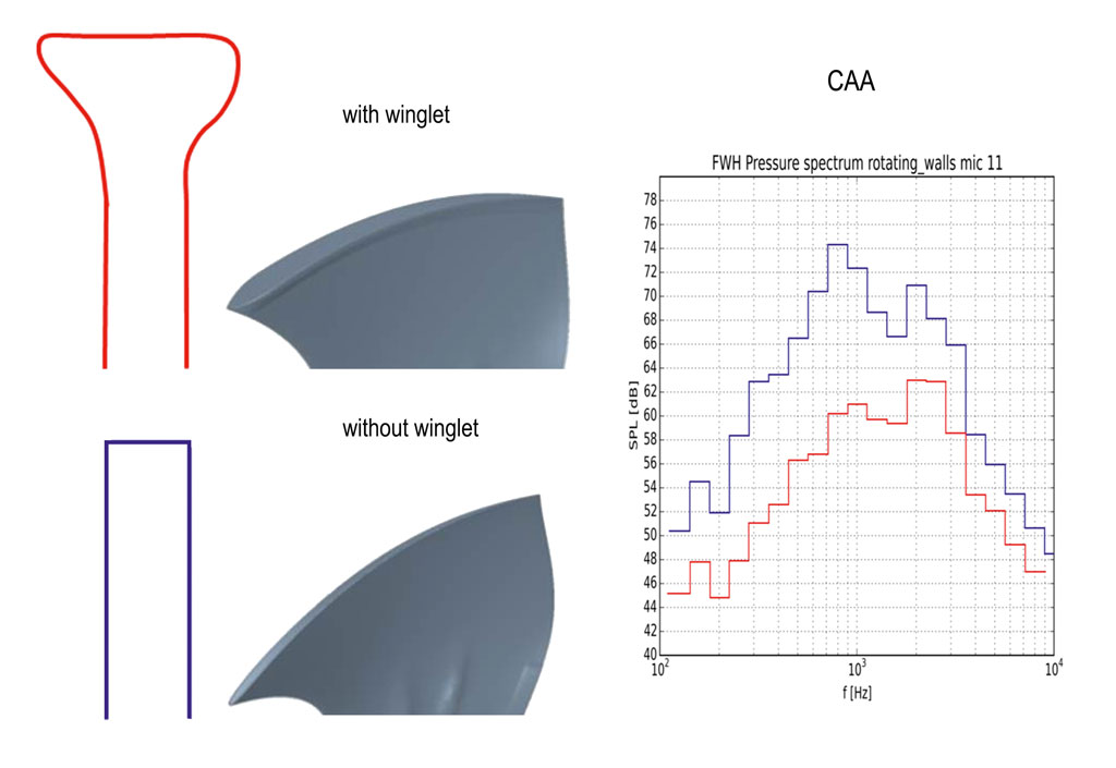 This is where winglets can help. These curved end caps added to the blade tips influence the tip gap flow and the vortices that form and so significantly reduce the noise level (Fig. 5). This has a positive effect on the tip gap flow, thus reducing the interaction of the flow with the edges. The sound power drops by up to 10 dB as a result.